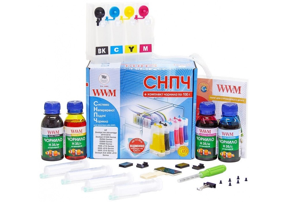 Система непрерывной подачи чернил (СНПЧ) — устройство для струйного принтера,подающее чернила к печатающей головке из пополняемых резервуаров (ёмкостей-доноров). Использование СНПЧ снижает затраты на печать в десятки раз.В Вашем принтере используются интегрированные картриджи (печатающая головка и ёмкость для чернил в одном корпусе) шлейф СНПЧ подсоединяется напрямую к оригинальному картриджу, по-этому оригинальные картриджи должны быть работоспособными. ВАЖНО: Данная модель СНПЧ не комплектуется оригинальными картриджами. Установка проводится на оригинальные картриджи HP 46, HP 121, HP 122, HP 650, HP 901 или HP 121XL, HP 122XL, HP 901XL. Преимущества СНПЧ WWM: • Гарантия на СНПЧ и печатающее устройство 12 месяцев. См. гарантийное обязательство; • Гарантийный срок годности чернил WWM – 5 лет (чёрные пигментные – 3 года, цветные пигментные – 2 года); • СНПЧ WWM укомплектовано набором чернил - по 100 гр. каждого цвета; • Пошаговая инструкция с фотографиями по установке СНПЧ; • Сервисная поддержка в авторизованных сервисных центрах WWM (АСЦ) по всей Украине; • Простота и удобство в использовании; • Надёжная работа системы подтверждена тестированием в собственном испытательном центре компании; • Наличие демпферного компенсатора перепадов атмосферного давления обеспечивает стабильную работу СНПЧ WWM. Комплектация СНПЧ: • ёмкости-доноры с силиконовым шлейфом для подачи чернил; • набор профессиональных чернила 4 по 100г H35/BP, H35/C, H35/M, H35/Y; • фиксаторы шлейфа подачи чернил – 2 шт.; • шприцы для заправки чернил – 4 шт.; • перчатки – 1 пара; • салфетка; • сверло – 1 шт.; • инструкция. Совместимость с печатающими устройствами: HP Deskjet 1000 J110a, 1000 J110c, 1000 J110d, 1000 J110e, 1050 AiO J410a, 1050 AiO J410b, 1050 AiO J410c, 1050 AiO J410d, 1050 AiO J410e, 1050A AiO J410a, 1050A AiO J410g, 1050A AiO J410h, 1051A AiO J410f, 1510 AiO 2000 J210a, 2000 J210b, 2000 J210c, 2050 AiO J510a, 2050 AiO J510c, 2050 AiO J510d, 2050A AiO J510a, 2050A AiO J510c, 3000 J310a, 3050 AiO J610a, 3050 AiO J610b, 3050 AiO J610c, 3050 AiO J610d, 3050 AiO J610e, 3050 AiO J610f , 3050A e-AiO J611b, 3052A e-AiO J611f, 3054A e-AiO J611d. HP Deskjet D1663, D2563, D2645, D2660, D2663, D2668, D2680. HP Deskjet F2100, F2110, F2120, F2187, F2423, F2480, F2483, F2493, F380, F4213, F4224, F4275, F4280, F4283, F4483, F4583. HP Deskjet Ink Advantage 1015, 1515 AiO, 2515 AiO, 2545 AiO, 2645 e-AiO, 3515 e-AiO, 4645 HP Deskjet Ink Advantage 3545, 4515. HP Officejet 4500 g510a, 4500 g510g, 4500 g510n HP Officejet J4524, J4580, J4624, J4660, J4680 HP Photosmart C4683, C4783, C4793, C4795. Совместимость с картриджами: HP 46, HP 121, HP 122, HP 650, HP 901 HP 121XL, HP 122XL, HP 901XL Производитель: Worldwide Manufacturing, E.D. (торговая марка WWM) - украинская компания, которая специализируется на производстве совместимых расходных материалов для принтеров. Контроль качества производства продукции сертифицирован по международному стандарту ISO 9001.
