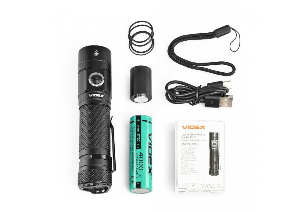 Портативный светодиодный фонарик VIDEX VLF-A353 900Lm 5000K предназначен для индивидуального использования в темное время суток или в помещениях без освещения. Основными показателями есть герметичность, надежный корпус, дальность света. Позволяет выбрать требуемый режим работы. Используется шнур для фонаря, обеспечивающий удобное использование и транспортировку. В комплект также клипса и переходник для аккумулятора типа 18650. Также от фонаря можно заряжать другие устройства. Особенностью данной модели является наличие выхода USB-A (5В, 2А) на корпусе фонаря для подзарядки телефона и других гаджетов в экстренных случаях при необходимости.