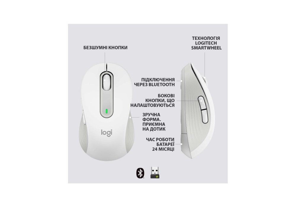 Бездротова миша Logitech Signature M650 L з технологією SmartWheel і бічними кнопками, що налаштовуються, забезпечує комфорт і допомагає підвищити ефективність офісної роботи. Під'єднання за допомогою USB-приймача Logi Bolt або через Bluetooth дає можливість заощаджувати місце на робочому столі й обходитися без дротів.