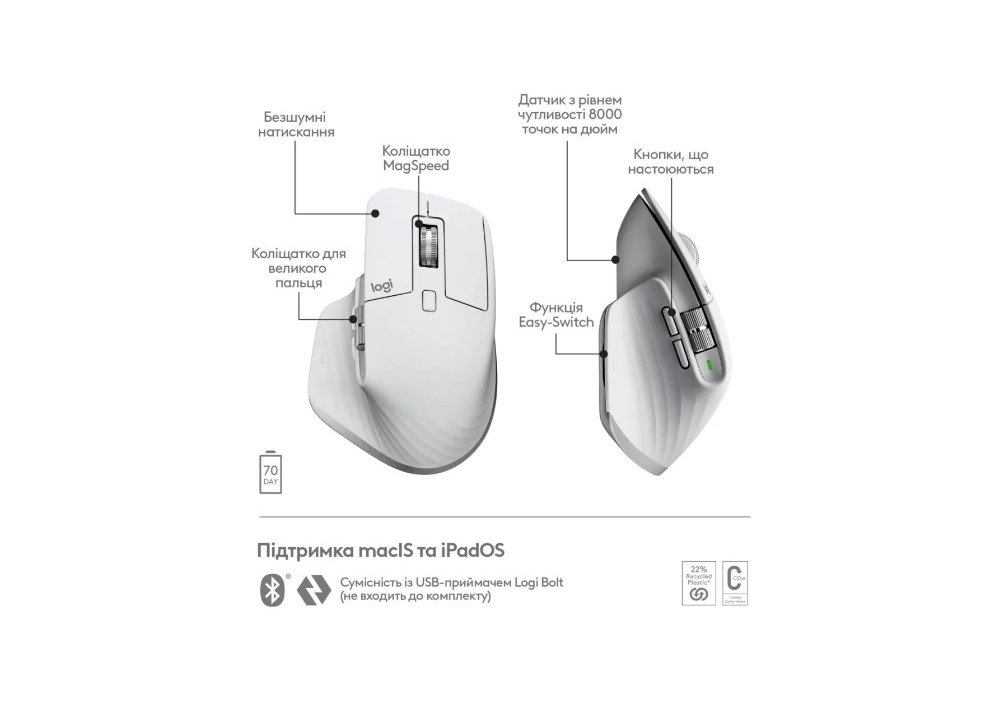 MX Master 3S для Mac працює до 70 днів без підзарядки при повному заряді - і отримує три години роботи від однієї хвилини швидкого заряду.