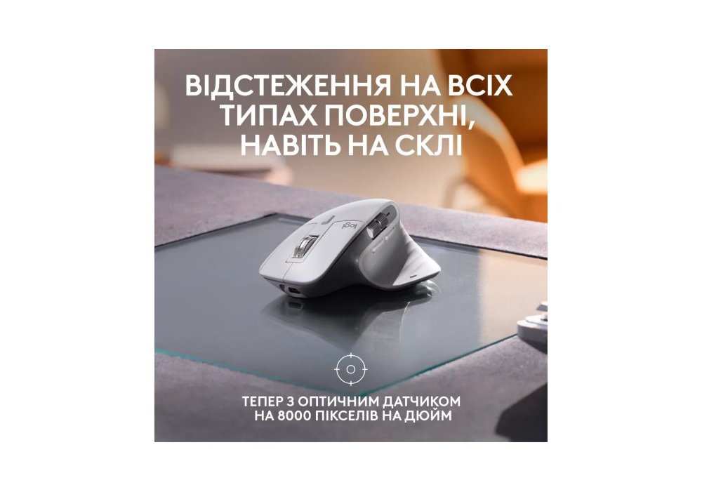 Працюйте на моніторах з великою роздільною здатністю з оптичним сенсором точності 8 000 DPI, який відстежує практично в будь-якому місці - навіть на склі.. Налаштуйте чутливість відстеження у Logi Options+.