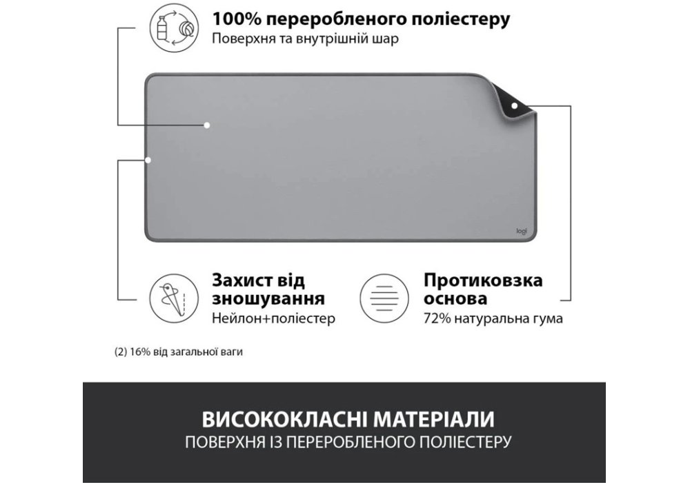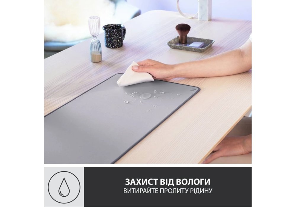 Однією з ключових переваг килимка Logitech Desk Mat Studio Series Mid Grey є його стильний дизайн у середньо-сірому відтінку, що доповнить будь-який робочий простір, надаючи йому сучасного вигляду. Цей килимок стане чудовим доповненням як для домашнього офісу, так і для робочого місця в компанії.