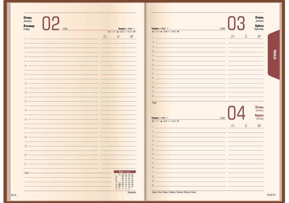 Одна сторінка – один робочий день, субота та неділя на одній сторінці, інформаційний блок – 4 сторінки, блок для нотаток в клітинку - 30 сторінок.
