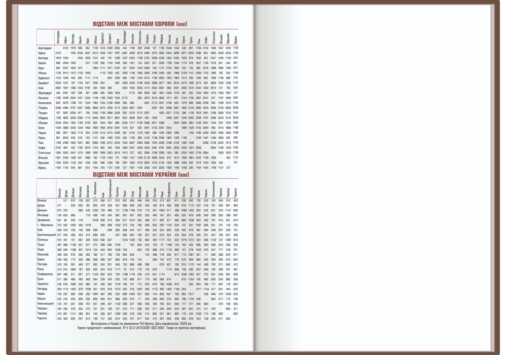 Кольори друку – бордо та темно-сірий, форзац – повно кольорові мапи України та Європи, відривний куточок, перфорація по колу, закладка – шовкова стрічка бордового кольору, на полях сторінок – регістри із зазначенням поточного місяця.