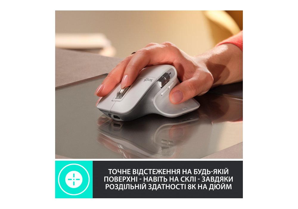 Оптичний сенсор з роздільною здатністю 8000 пікселів на дюйм відстежує положення миші практично всюди - навіть на склі. (Товщина скляної поверхні повинна становити не менше 4 мм.) А в ПЗ Logi Options+ можна налаштувати чутливість відстеження, задавши відповідне значення для поточного робочого процесу та роздільної здатності монітора. (Потрібно інсталювати програмне забезпечення Logi Options+ для Windows або macOS)