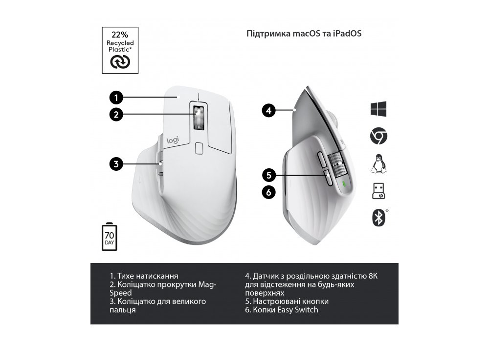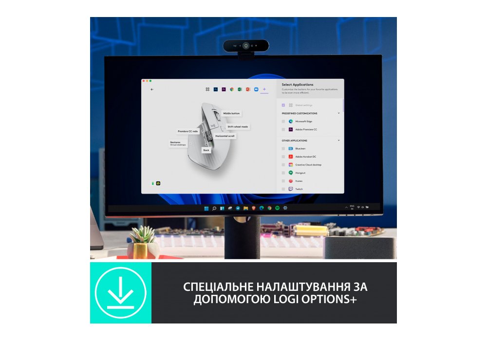 Працюйте одразу з кількома пристроями й операційними системами, налаштовуйте окремі кнопки, задавайте спеціальні параметри для програм, оптимізуйте майже кожен крок робочого процесу та регулюйте швидкість відстеження у ПЗ Logi Options+. (Потрібно інсталювати програмне забезпечення Logi Options+ для Windows або macOS)