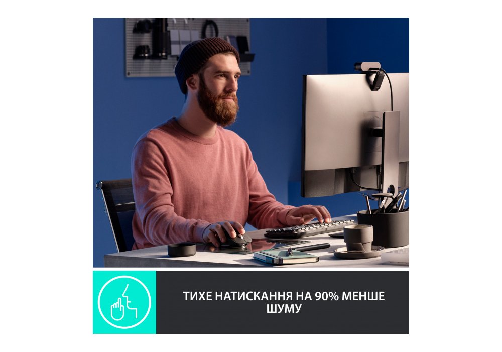 Представляємо Quiet Clicks – технологію практично безшумної тактильної віддачі для роботи та творчості. Кнопки Quiet Clicks забезпечують приємне тактильне відчуття при натисканні, але звучать на 90% тихіше за звичайні. (У порівнянні з MX Master 3 рівень звукової потужності при клацанні лівою та правою кнопкою миші MX Master 3S на 90% нижче (при вимірюванні на відстані 1 м).).