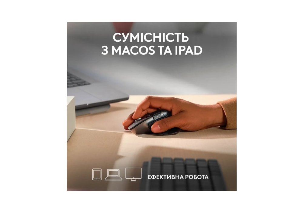 Створюйте, робіть і виконуйте завдання з тим самим відчуттям натискання, але з меншим шумом. Тихі кліки надають задоволення від м'якого тактильного відгуку з 90% меншим рівнем шуму від кліків. Скульптурна форма, що враховує форму вашої руки, унікальний нахил MX Master 3S для Mac розташовує вашу руку в природнішому положенні, забезпечуючи кращий комфорт.