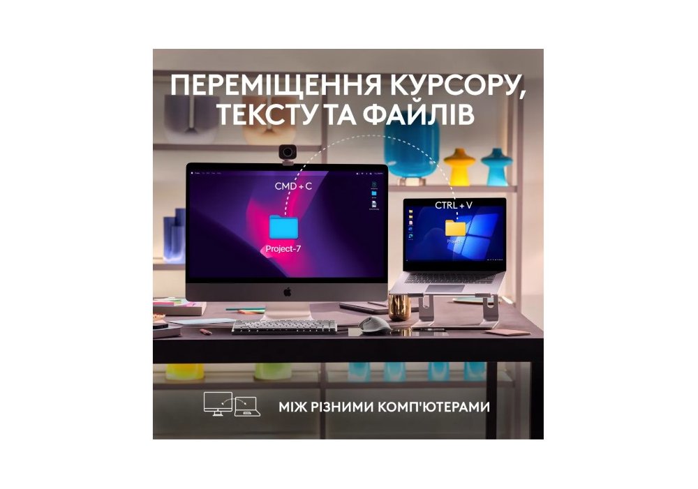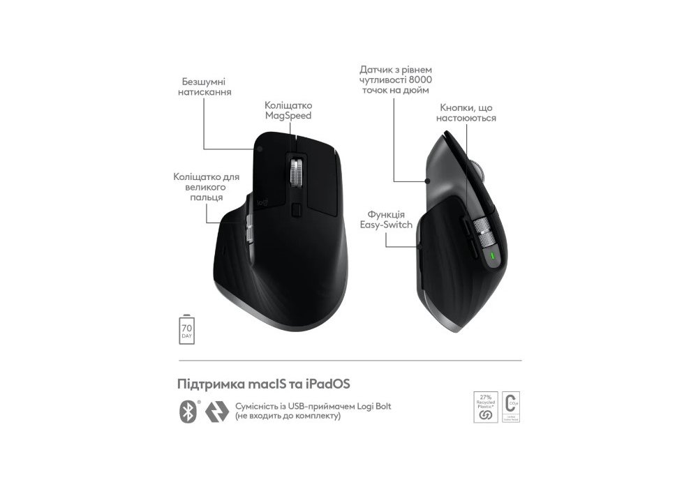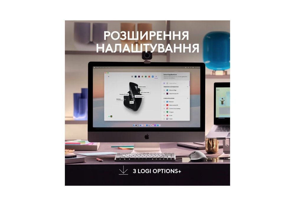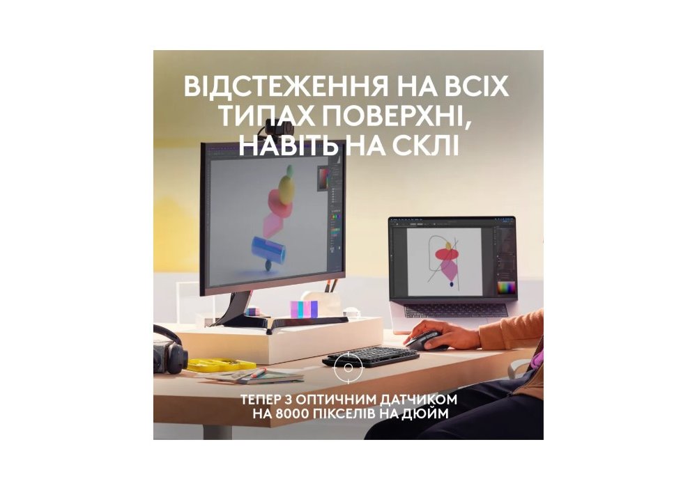 Працюйте на моніторах з великою роздільною здатністю з оптичним сенсором точності 8 000 DPI, який відстежує практично в будь-якому місці - навіть на склі. Налаштуйте чутливість відстеження у Logi Options+.