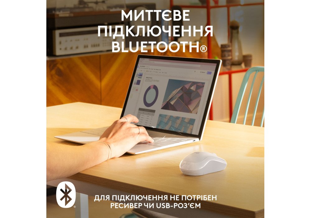 M240 Silent під'єднується за лічені секунди за допомогою надійного під'єднання Bluetooth для пари та відтворення — не потрібен ключ або порт. Працює з Windows, macOS, Chrome OS, Linux, Android.