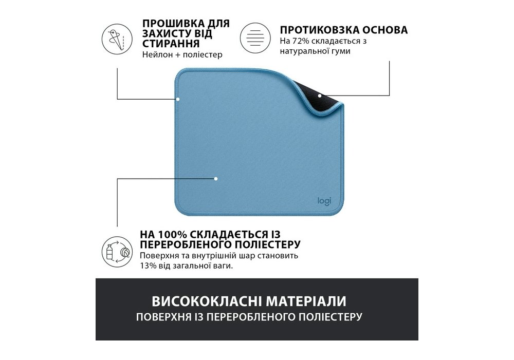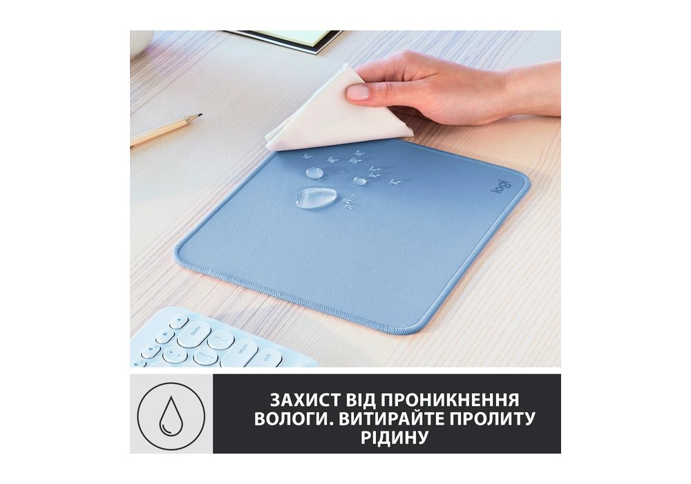 Килимок Logitech Mouse Pad має вологозахищене покриття, що дає змогу йому не вбирати випадково розлиту рідину. Ви можете просто витерти її вологою серветкою.