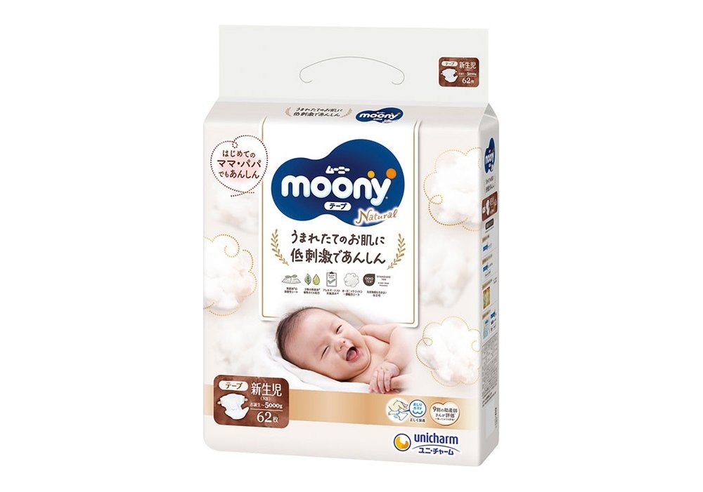 Moony Natural - м’які, ультратонкі та дихаючі одноразові підгузки з високоякісних матеріалів і високою поглинаючою здатністю. Вони клінічно протестовані та рекомендовані для використання у дитячій гігієні вже з перших днів життя. Підгузки мають округлу форму, їх еластичні липучки та комфортний виріз для пупка забезпечують додатковий комфорт для малюка. Форма внутрішньої поверхні стала більш анатомічною, завдяки цьому підгузок повністю повторює вигини тіла малюка.