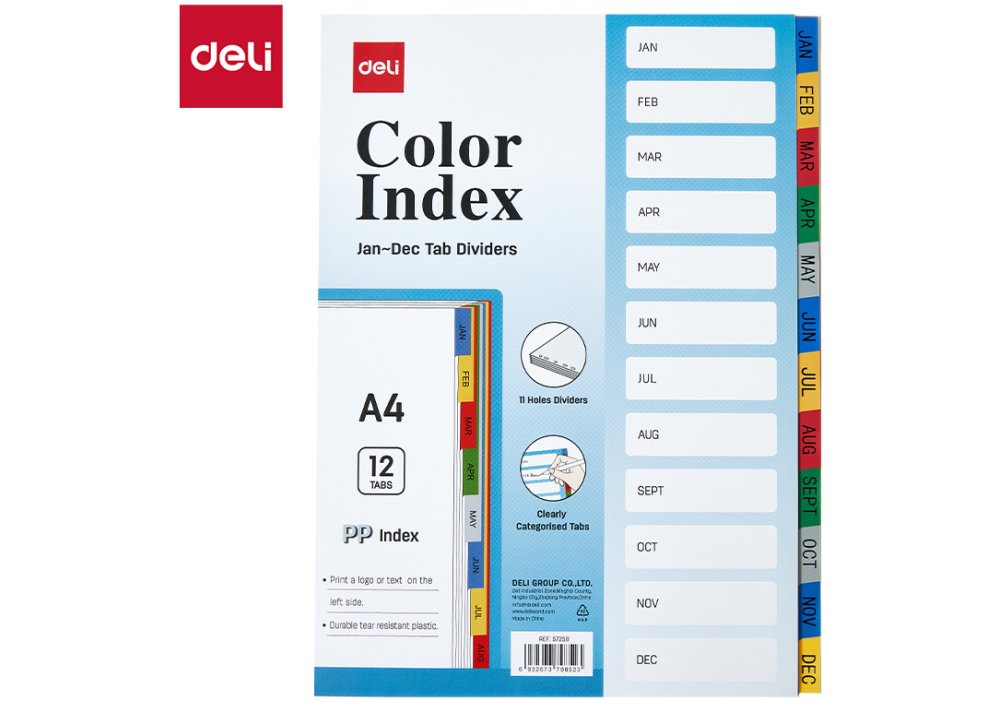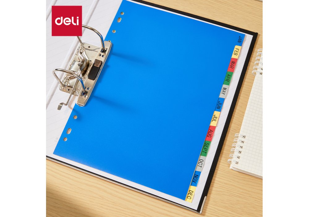 Кольорові індексні розділювачі Deli Color Index призначені для зручної та наочної систематизації документів формату A4. Набір охоплює 12 місяців (Jan–Dec / січень-грудень), що робить його ідеальним рішенням для щорічного планування, архівації та роботи з великими обсягами паперів.
